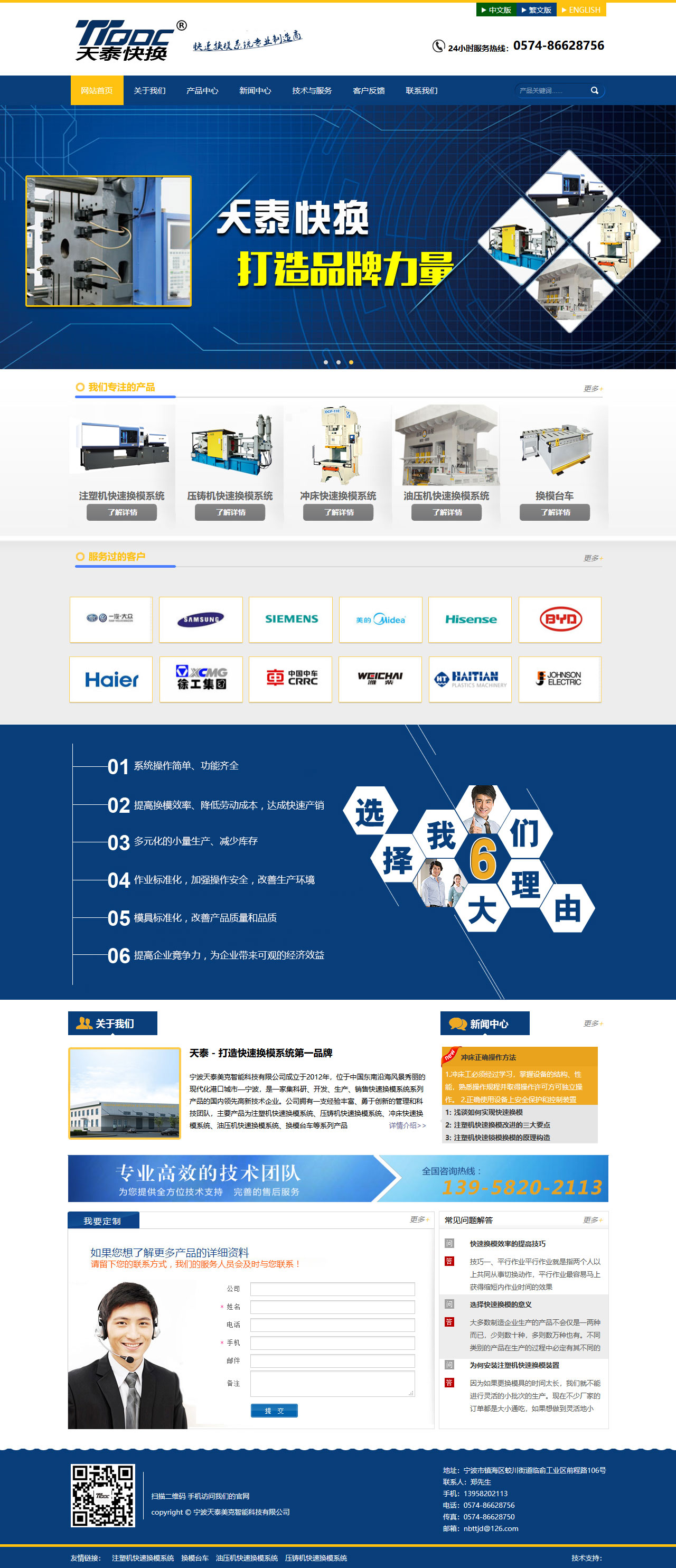 寧波天泰美克智能科技有限公司成立于2012年,位于中國東南沿海風景秀麗的現代化港口城市——寧波市,是一家集科研、開發、生產、銷售快速換模系統系列產品的國內領先的高新技術企業。公司擁有一支經驗豐富、勇于創新的管理和科技團隊,并與國內外著名企業合作研發,主要產品為注塑機快速換模系統、壓鑄機快速換模系統、沖床快速換模系統、油壓機快速換模系統、換模臺車等系列產品。